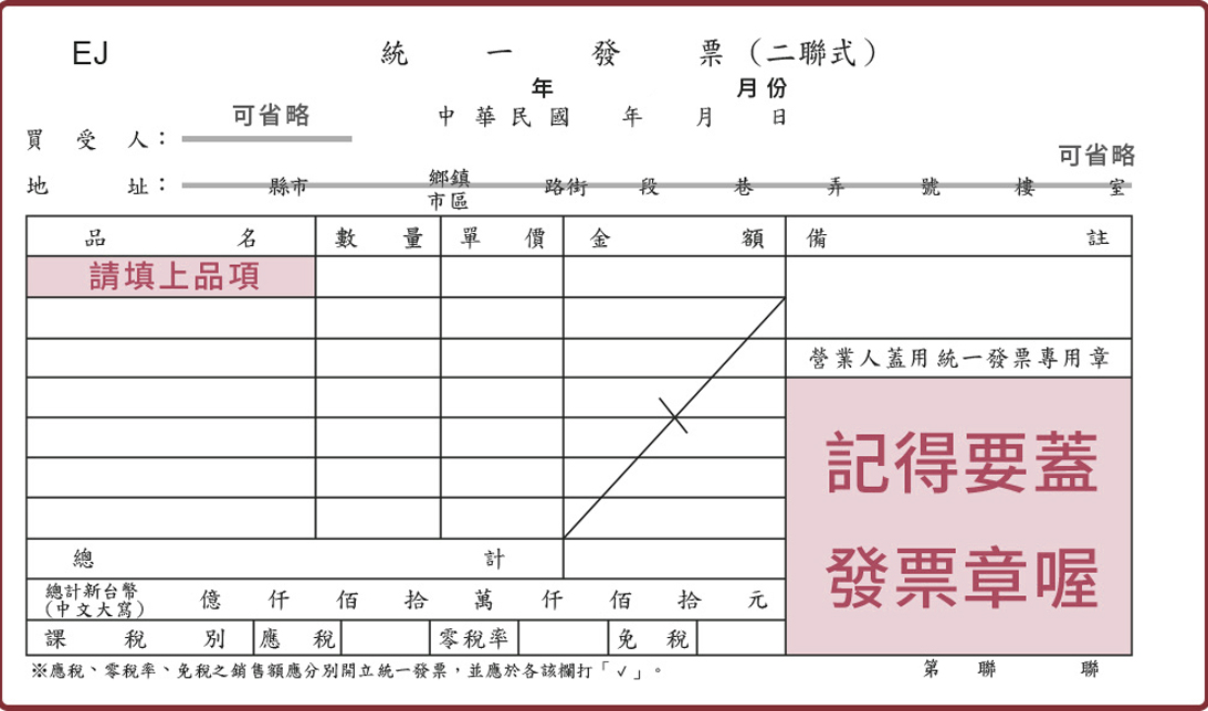 金額:銷售額(未稅)、營業稅金額、總計(含稅金額);二聯式不區分出營業稅額。